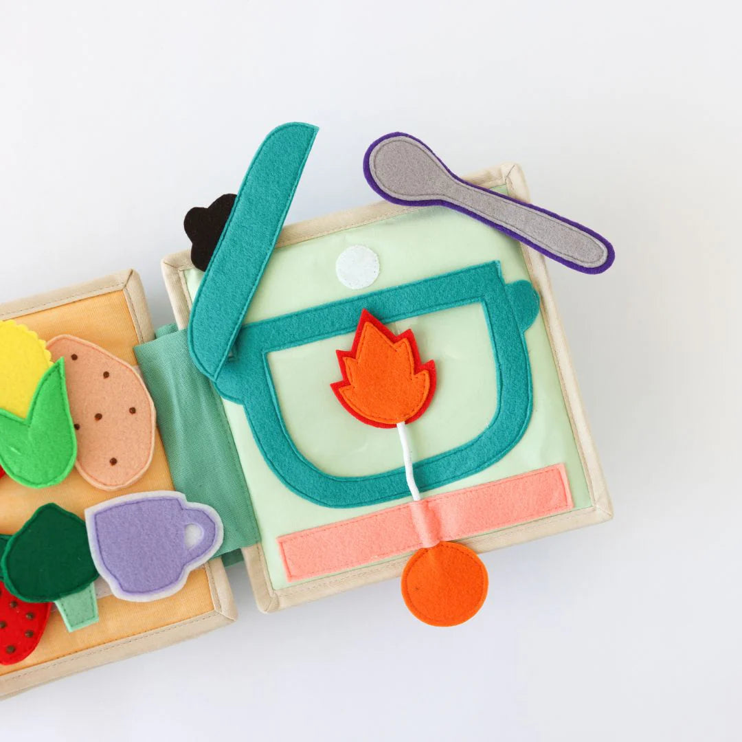 The playbook features three adorable finger puppets in unique colors, along with a buckle and an enchanting animal train. The back page showcases a stove top complete with a selection of vegetables, fruits, and a teacup, providing endless opportunities for storytelling and creative play.